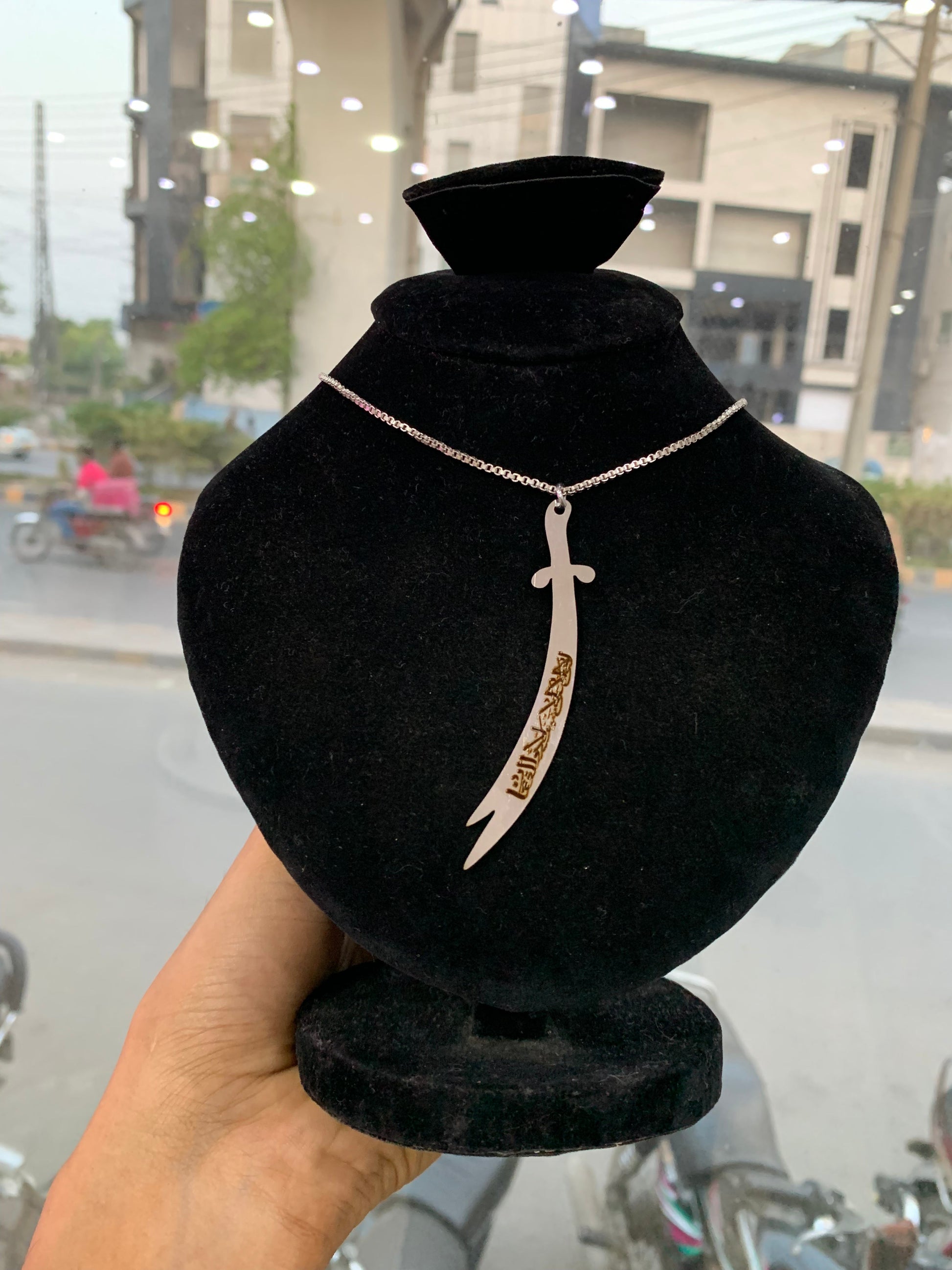 Zulfiqar Locket is based on Imam Ali's two edged sword. You can wear as pendant/necklace or hang on car mirror for charm decoration. Silvertone alloy material used for this pendant which keeps it light weight for comfortable wearing, yet giving it a premium look with fine finishing.